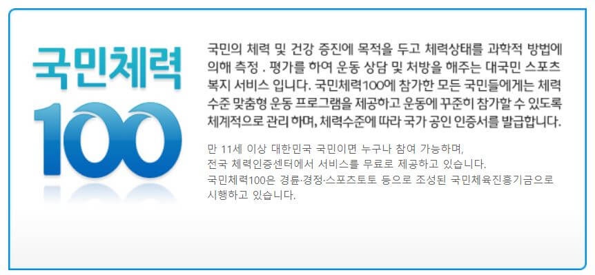 '국민체력100'이란 우리나라 국민의 체력 및 건강 증진을 위하여 국가에서 무료료 진행하는 무상 스포츠 복지 서비스의 일종입니다. '국민체력100'을 통해서 과학적인 체력측정과 개인별로 차별화된 맞춤 운동처방을 받을 수 있어, 체계적으로 체력을 관리할 수 있게 해주는 제도입니다.