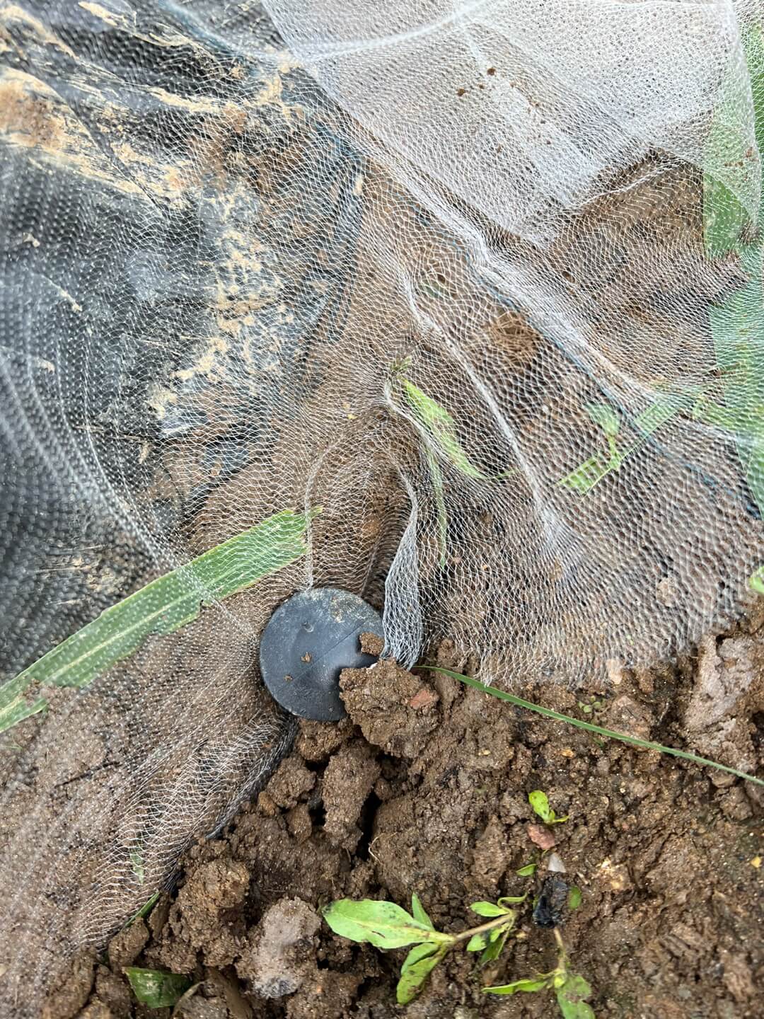 한랭사를 활대 위에 덮은 뒤, 철 핀 또는 플라스틱 대못으로 고정해 줍니다. 그 뒤 흙으로 잘 덮어서 빈틈이 없게 한 뒤 잘 고정해 줍니다. 철 핀이나 플라스틱 못이 있으면 고정하기는 편리하지만, 없어도 흙으로 잘 덮어주면 고정하는 데는 큰 어려움이 없습니다.
